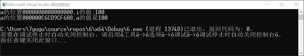 int main(){ int a,i=100; printf("a的位置%p,i的值:%d\n",a,i); a=&i; printf("a的位置%p,a的值是%d\n",&a,a); } [/cpp]